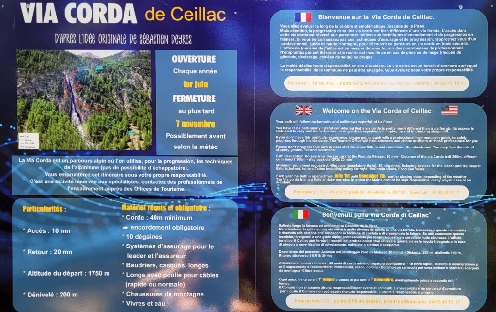 Classée en terre d’aventure (classement FFME), la pratique de la Via Corda se fait sous la responsabilité personnelle des utilisateurs en respect des règles éditées sur les panneaux d’affichage présents au parking du Mélezet et au pied de la Via Corda.
