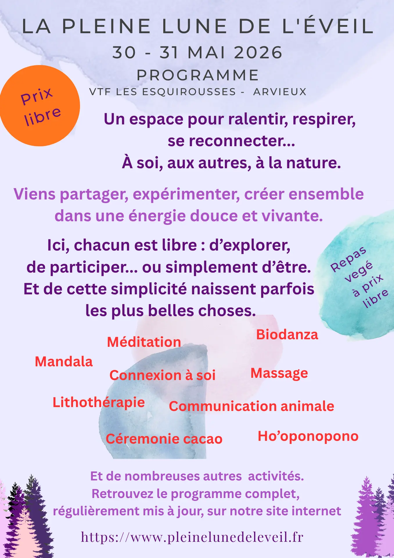 - 20H30 à 22H30 : Cérémonie de pleine Lune par Mathilde et Annelore.