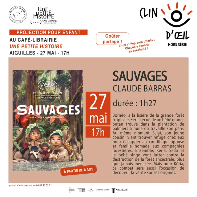 Le café librairie Une petite histoire en partenariat avec Bienvenue là-haut te propose d’assister à la projection du film d’animation « Sauvages ». Après Ma vie de courgette, Claude Barras expose la gravité de la déforestation tout en donnant espoir et goût des luttes citoyennes.
