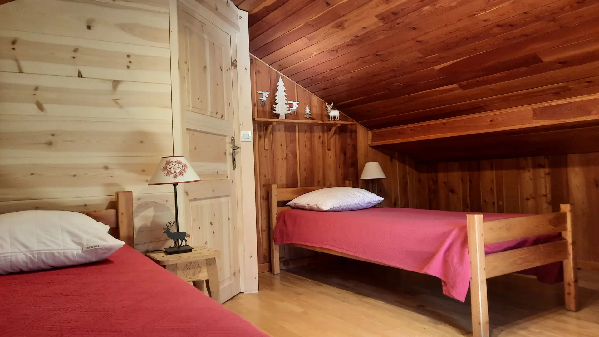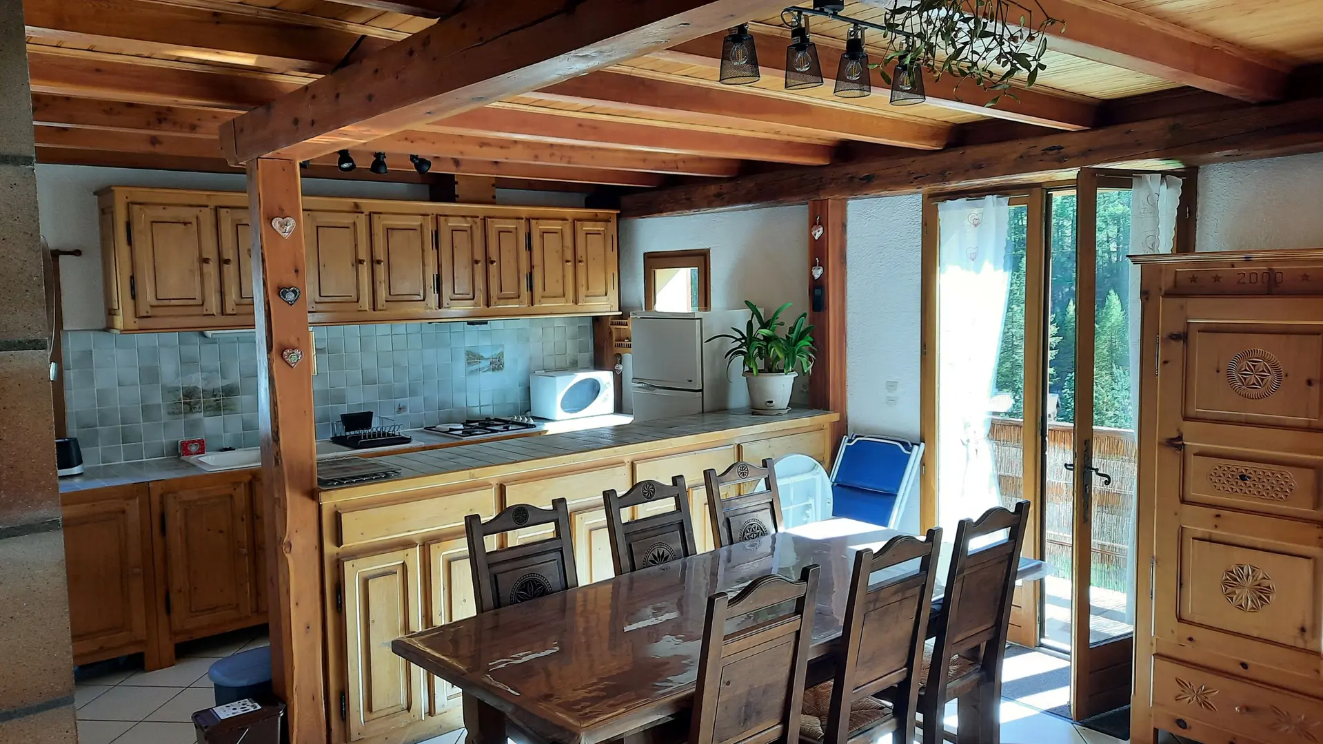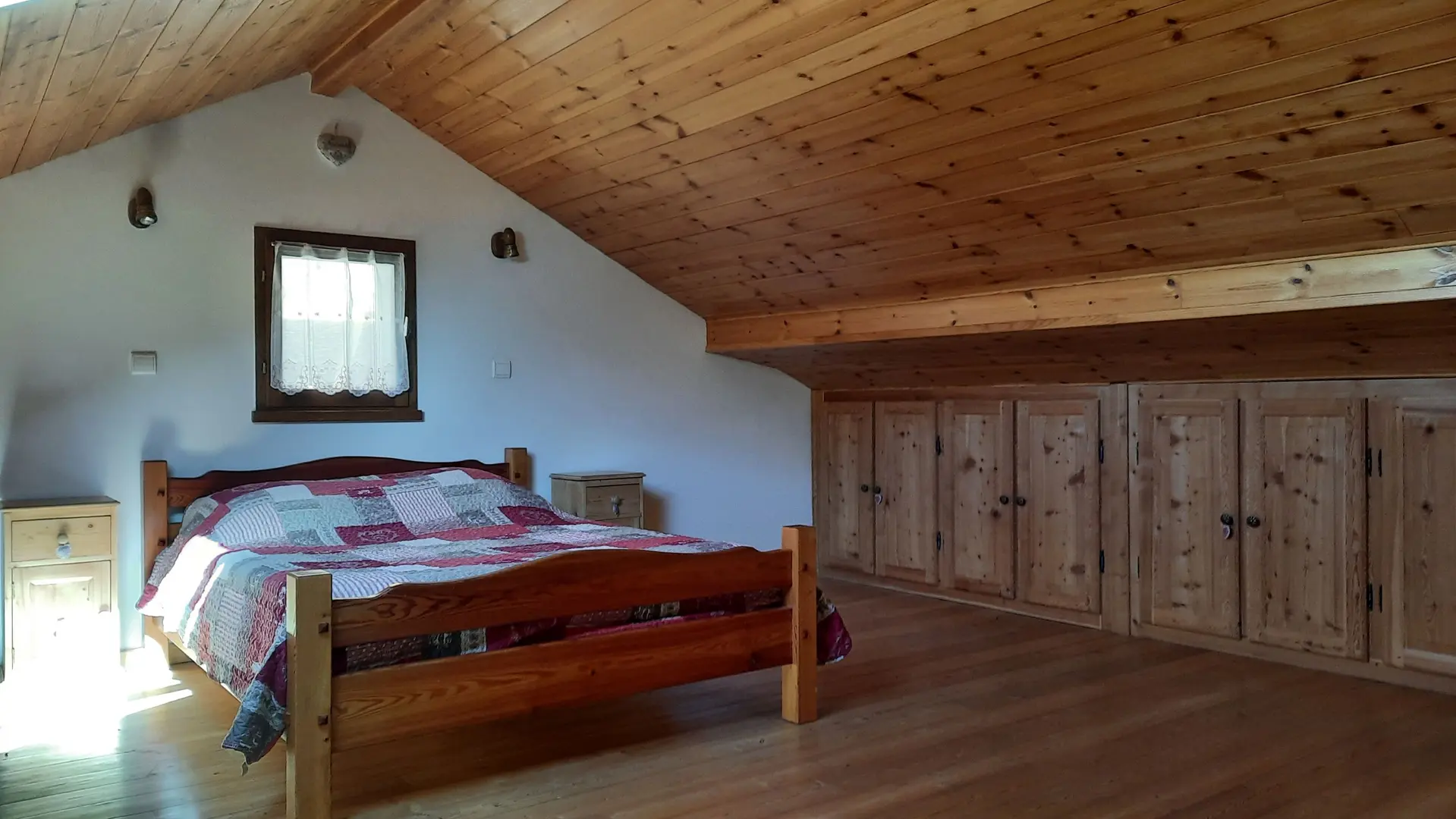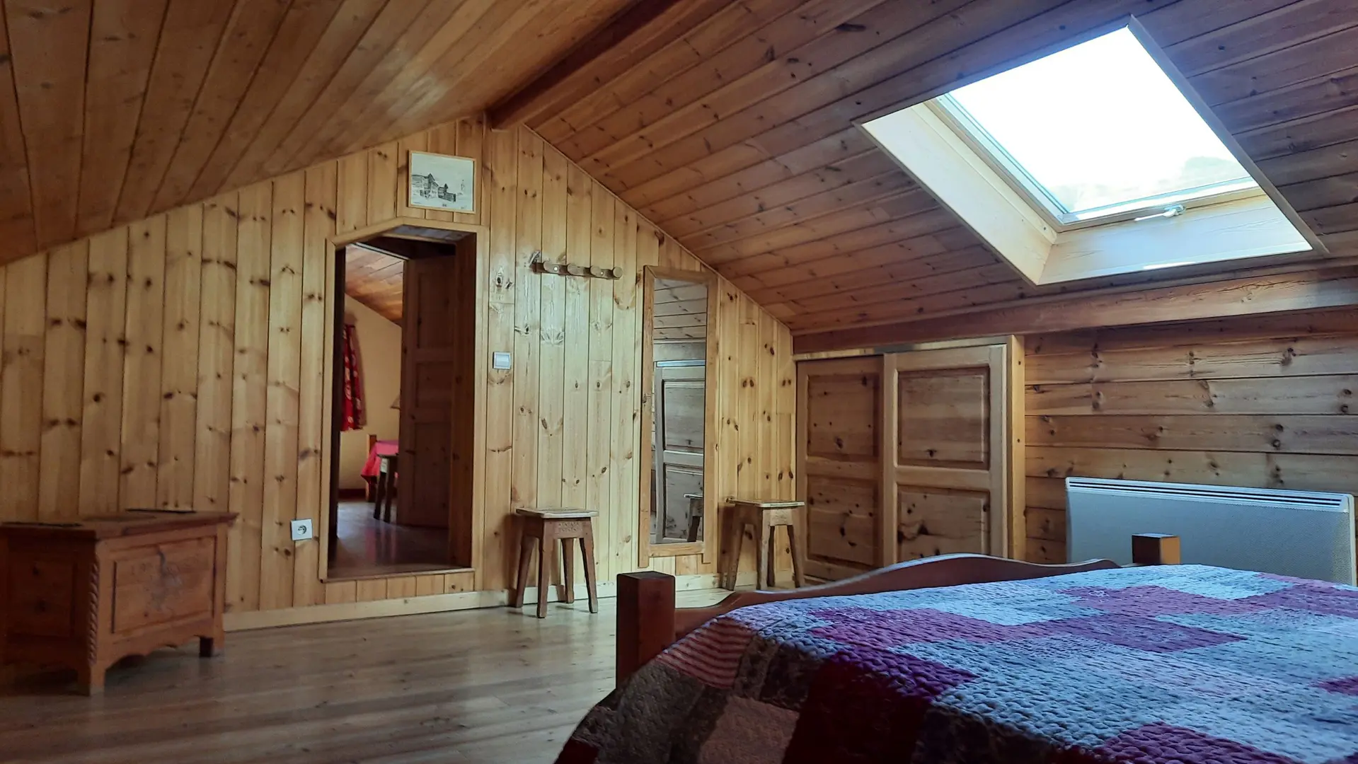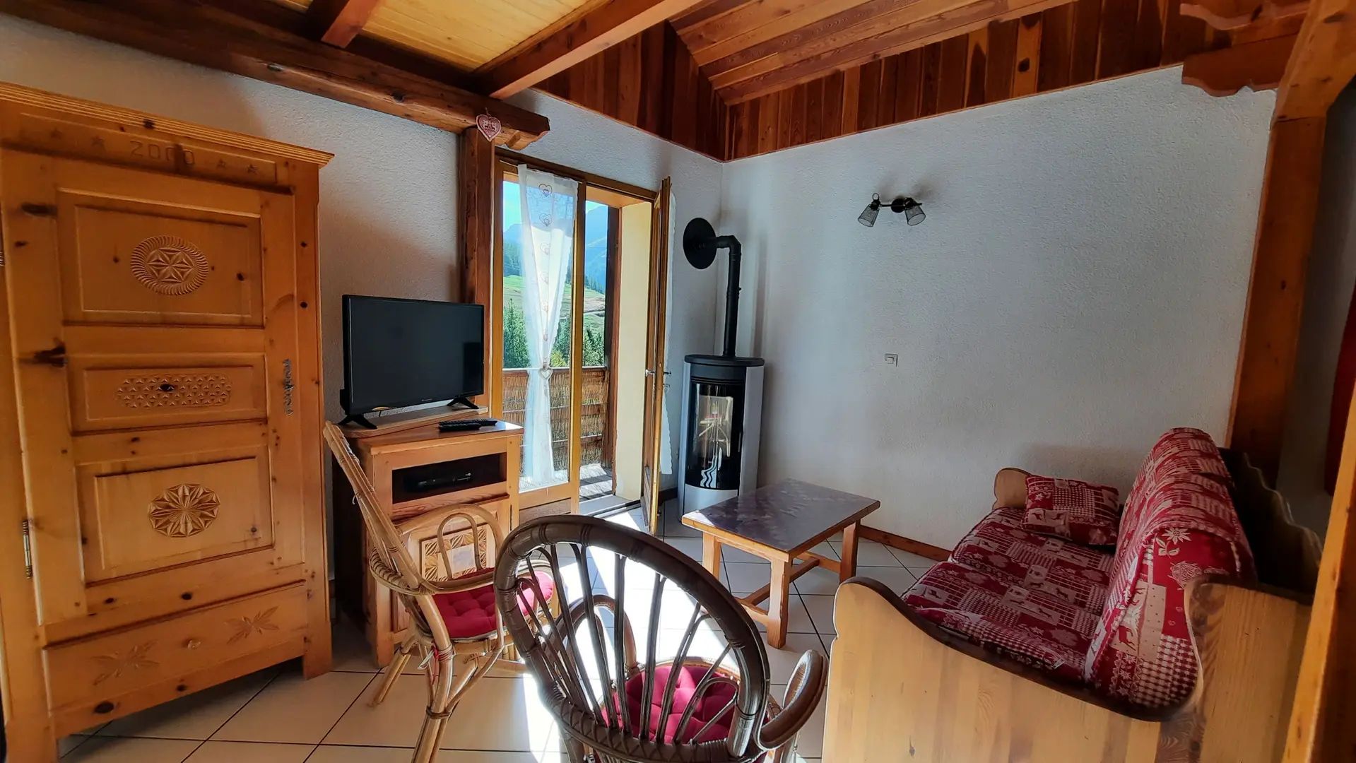 The entrance to the gîte opens onto a cosy living room and a fully-equipped kitchen. The main heating system with pellet stove provides a cosy atmosphere in winter. Also on the first floor, the toilet and bathroom are separate. The 2 attic bedrooms are upstairs. One has 1 double bed, a large closet and a storage cupboard; the other has 2 single beds and a storage cupboard with closet. The gîte is equipped with a TV and all the comforts of home, including a built-in oven, fridge/freezer combo, 4-burner hob and washing machine. A raclette or fondue machine is available on loan, as well as private parking close to the gîte and a ski room with ski rack and electric boot dryer.