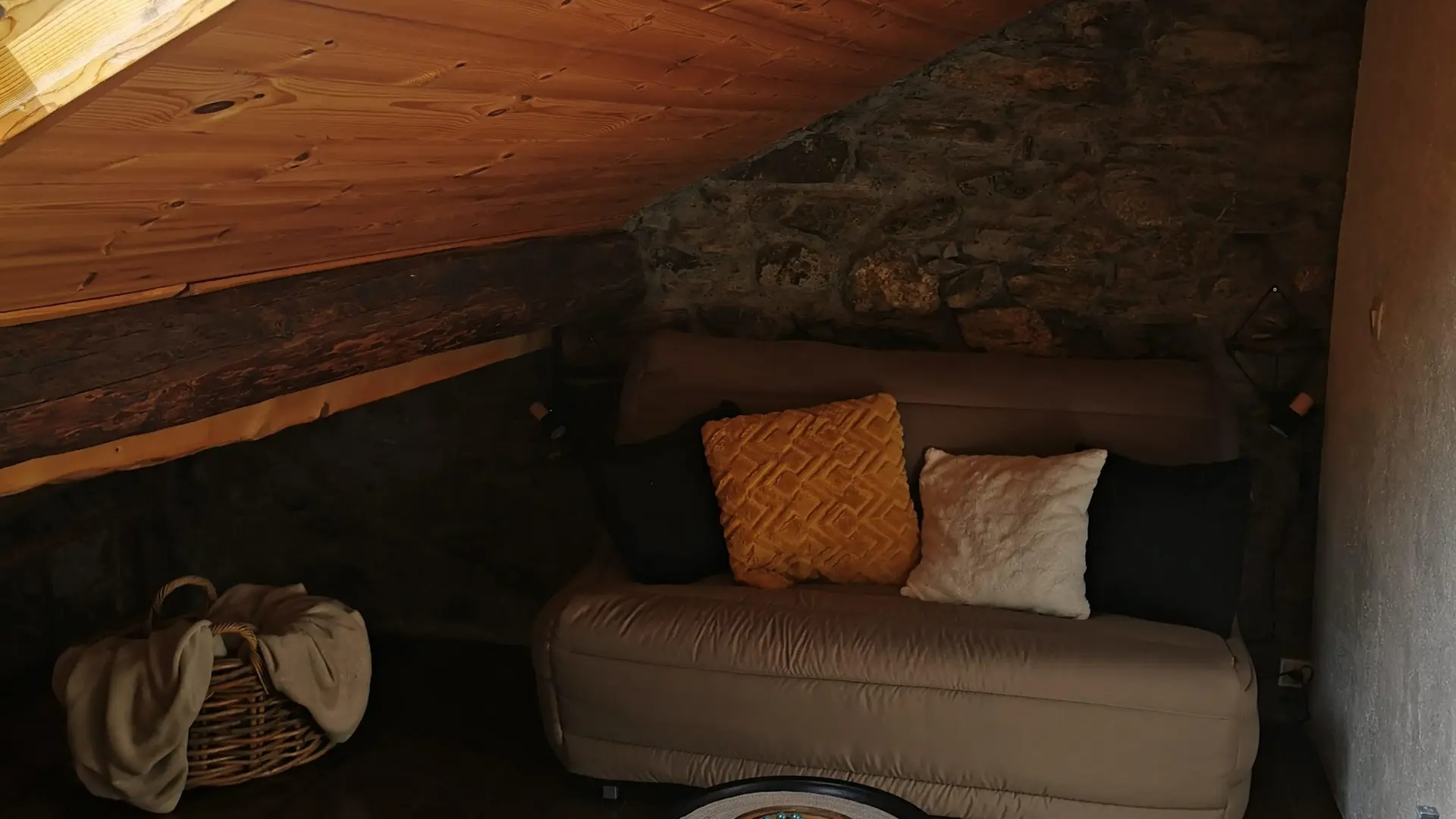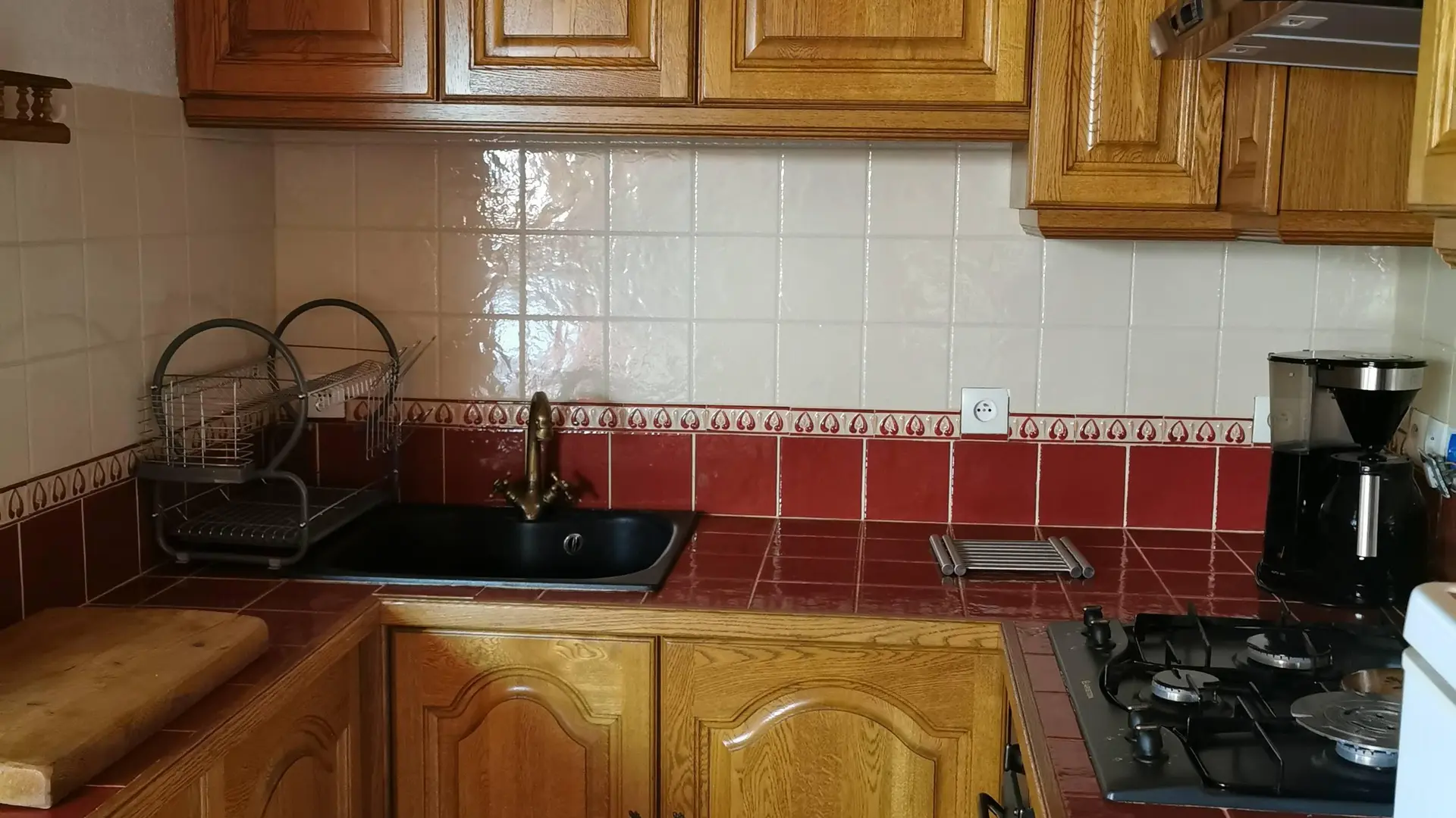 A few steps lead to a large terrace with garden furniture, barbecue, deckchairs, table and chairs. Then you enter the living room with fully-equipped kitchen (oven, microwave, filter and Tassimo coffee maker), dining area and large sofa.