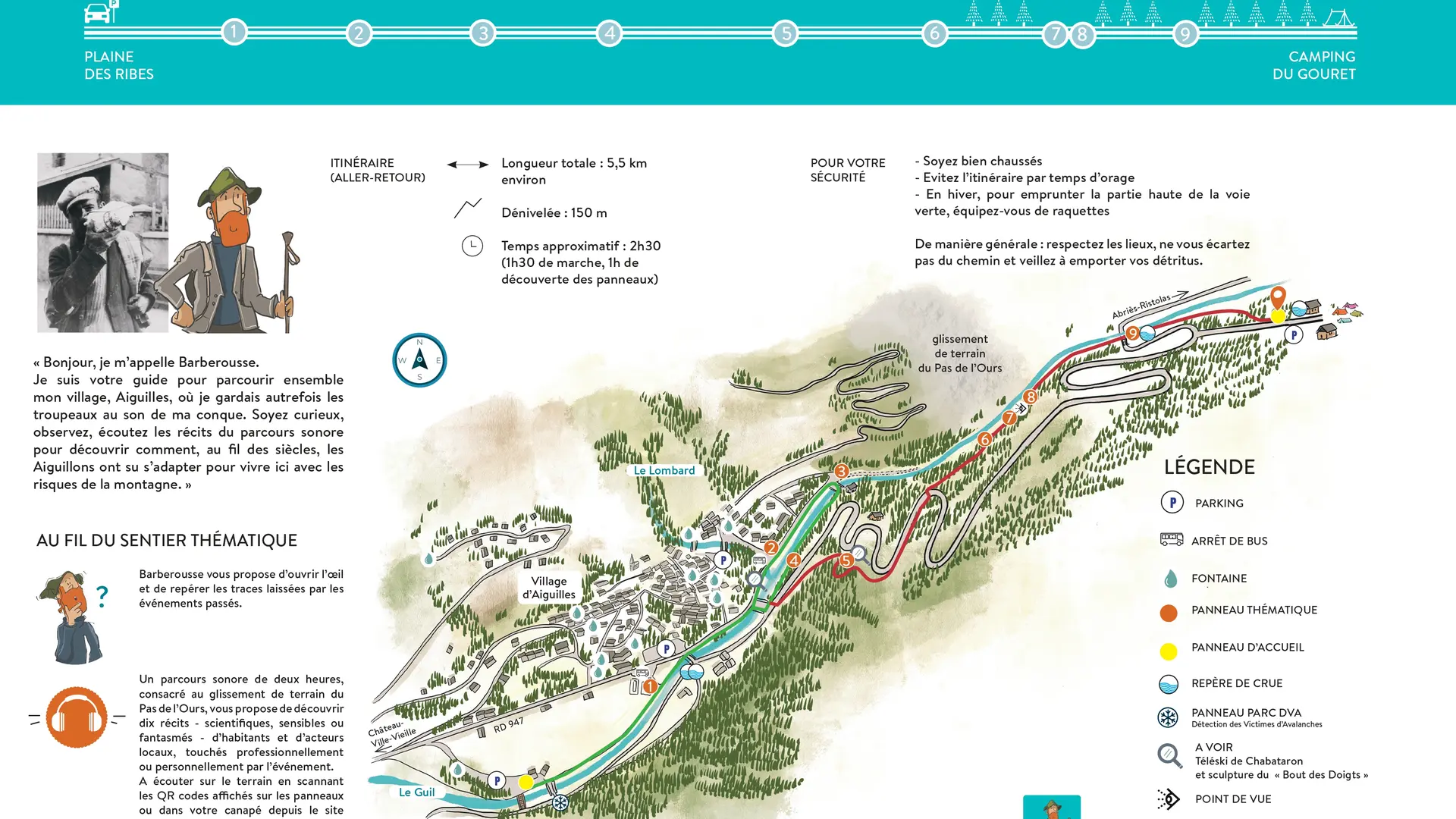 Follow Barbarossa to discover Aiguilles and its link with nature, a source of life (forest, grass, water...) but also of natural events that have left their mark on people and landscapes over the centuries.