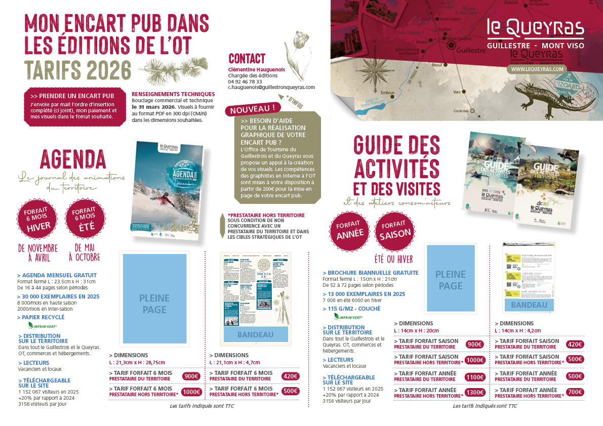 Afin d’augmenter la visibilité de votre structure et de votre activité, vous pouvez opter pour un encart publicitaire dans nos éditions. Différentes formules vous sont proposées pour figurer dans l’Agenda et le guide des activités et des visites.