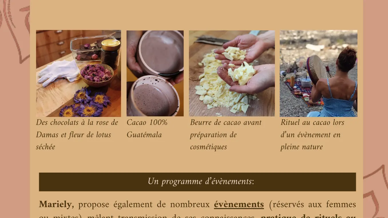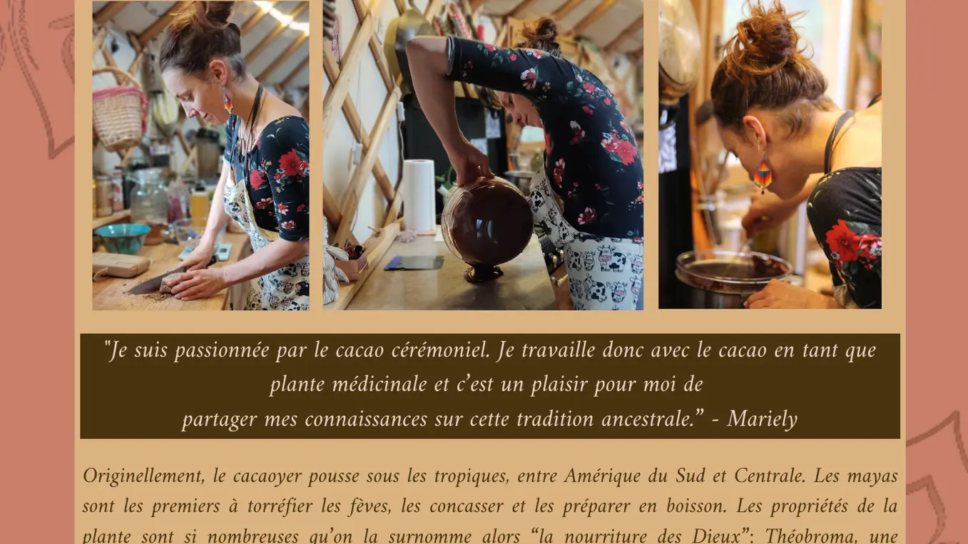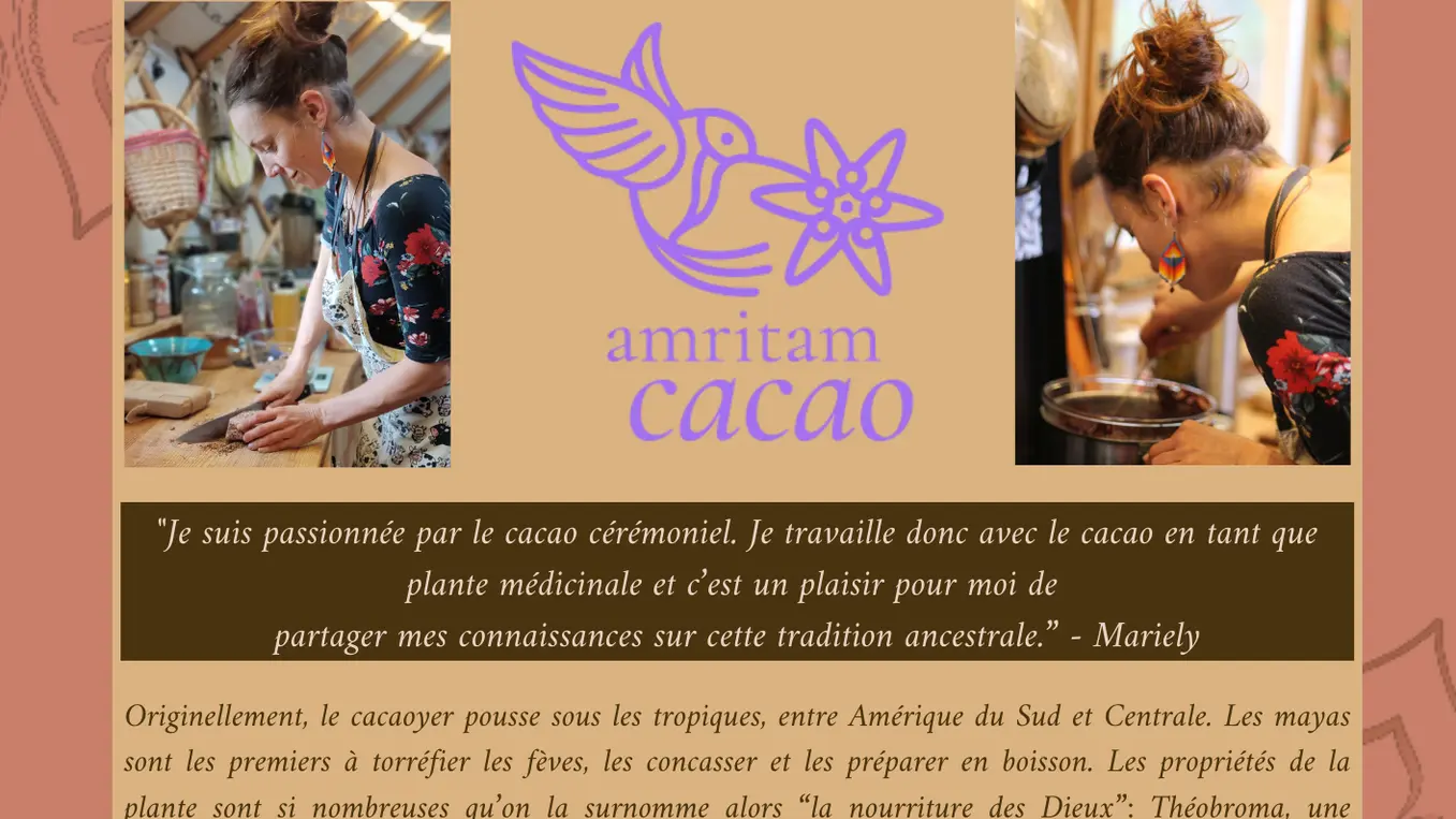Amritam Cacao propose plusieurs expériences : dégustation de cacao artisanal, création de chocolats aux plantes, ou immersion dans un rituel cacao pour un moment unique de reconnexion intérieure. Commerce direct et équitable : nous visitons personnellement les fermes et assurons des partenariats durables pour un cacao éthique et de qualité supérieure.