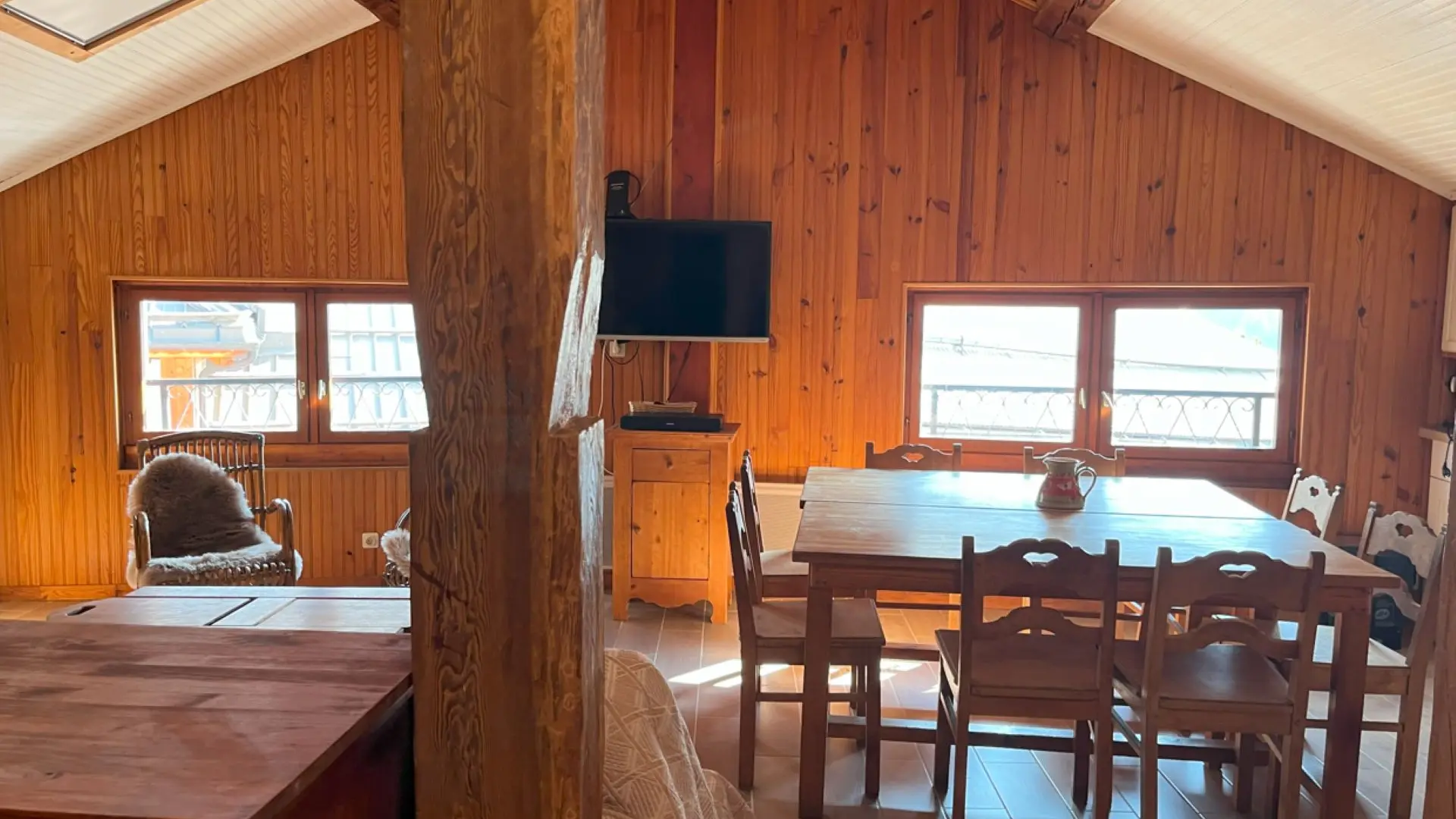 Ce vaste appartement est idéal pour un logement en montagne, avec du bois, des poutres, une belle luminosité . Il dispose d'une grande terrasse commune avec tables et grand barbecue accessible en redescendant l'escalier d’accès (un étage).