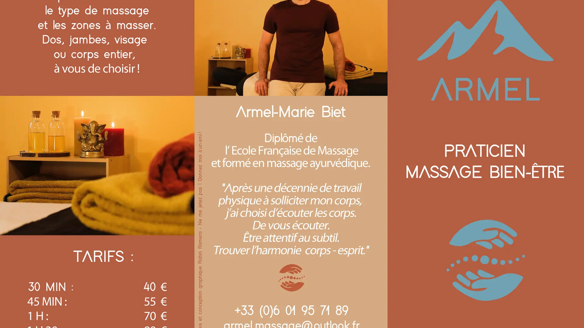 Massage de 30 minutes : 40€, à 1h30 : 90€