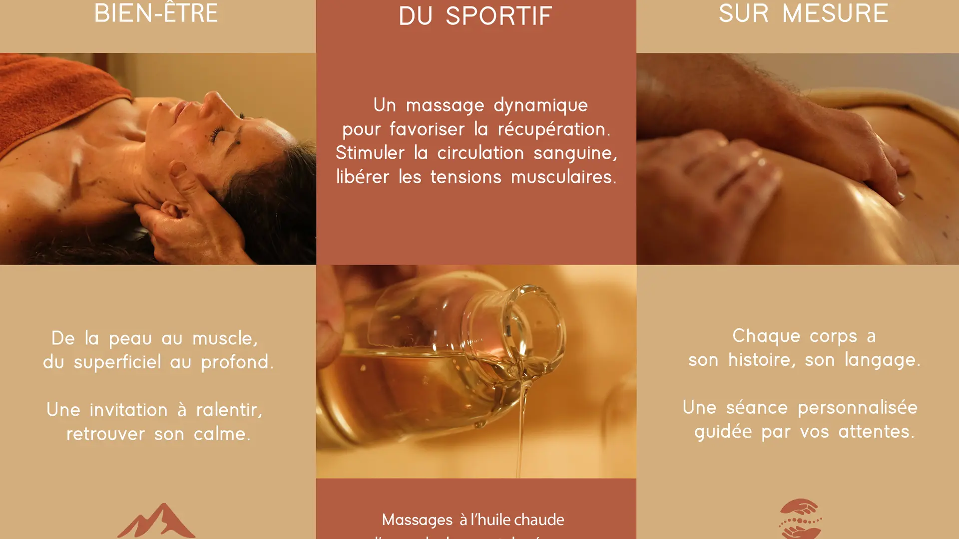 Le massage sportif : Conçu pour les sportifs réguliers, occasionnels ou en séjour à la montagne, le massage sportif combine techniques dynamiques et profondes.