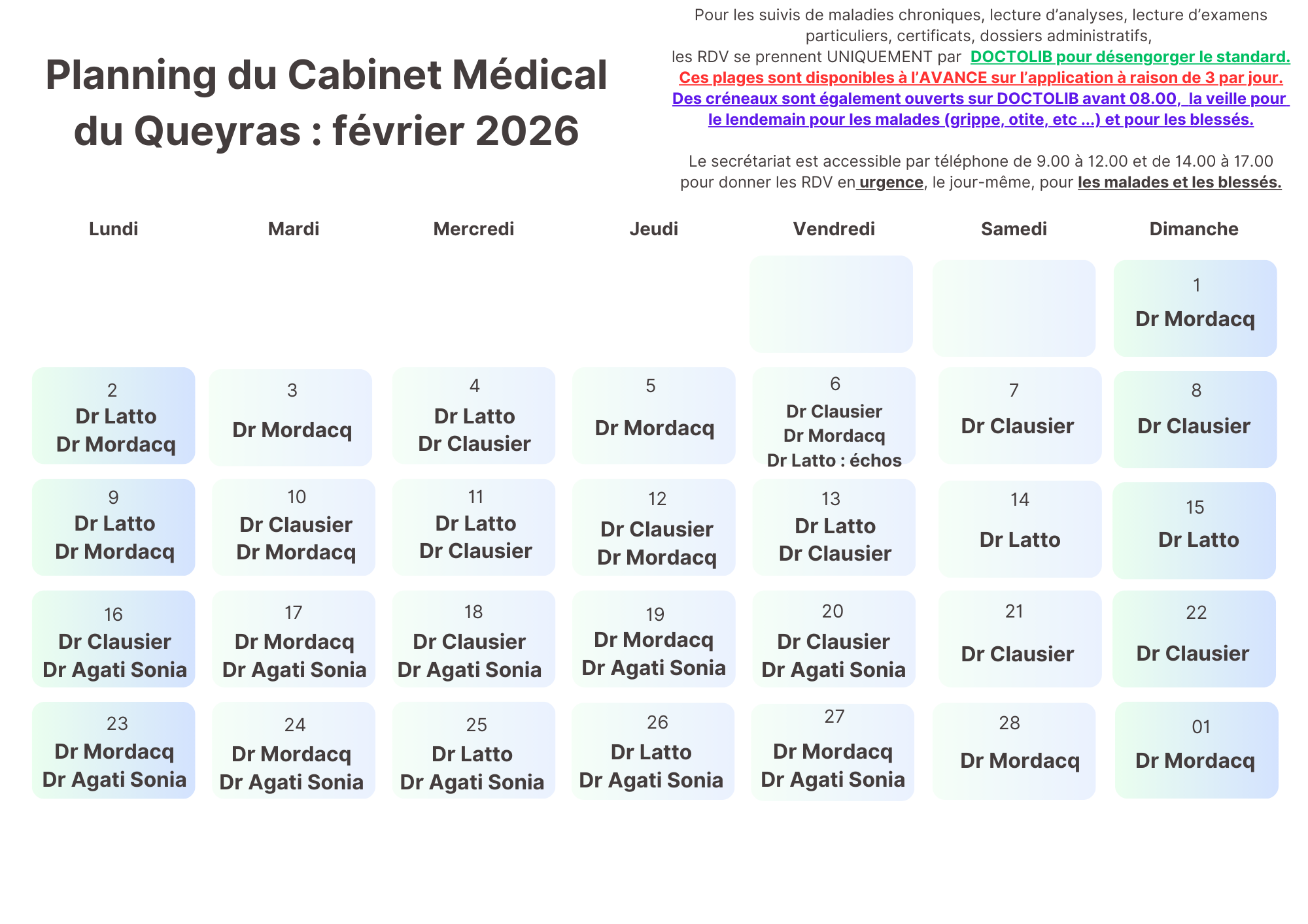 Tu trouveras ci-dessous le tableau des permanences et RDV des différents docteurs.