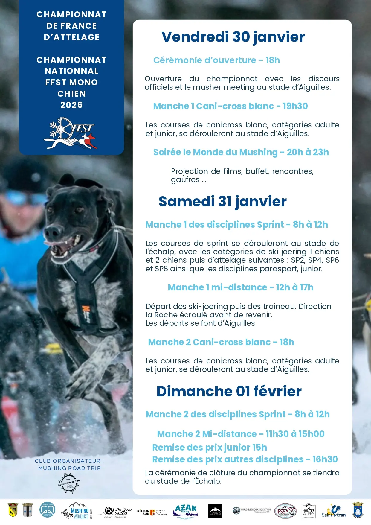 19h : Cérémonie d'ouverture : Ouverture du championnat avec les discours officiels et le musher meeting au stade d'Aiguilles. Première manche de cani-cross nocturne.