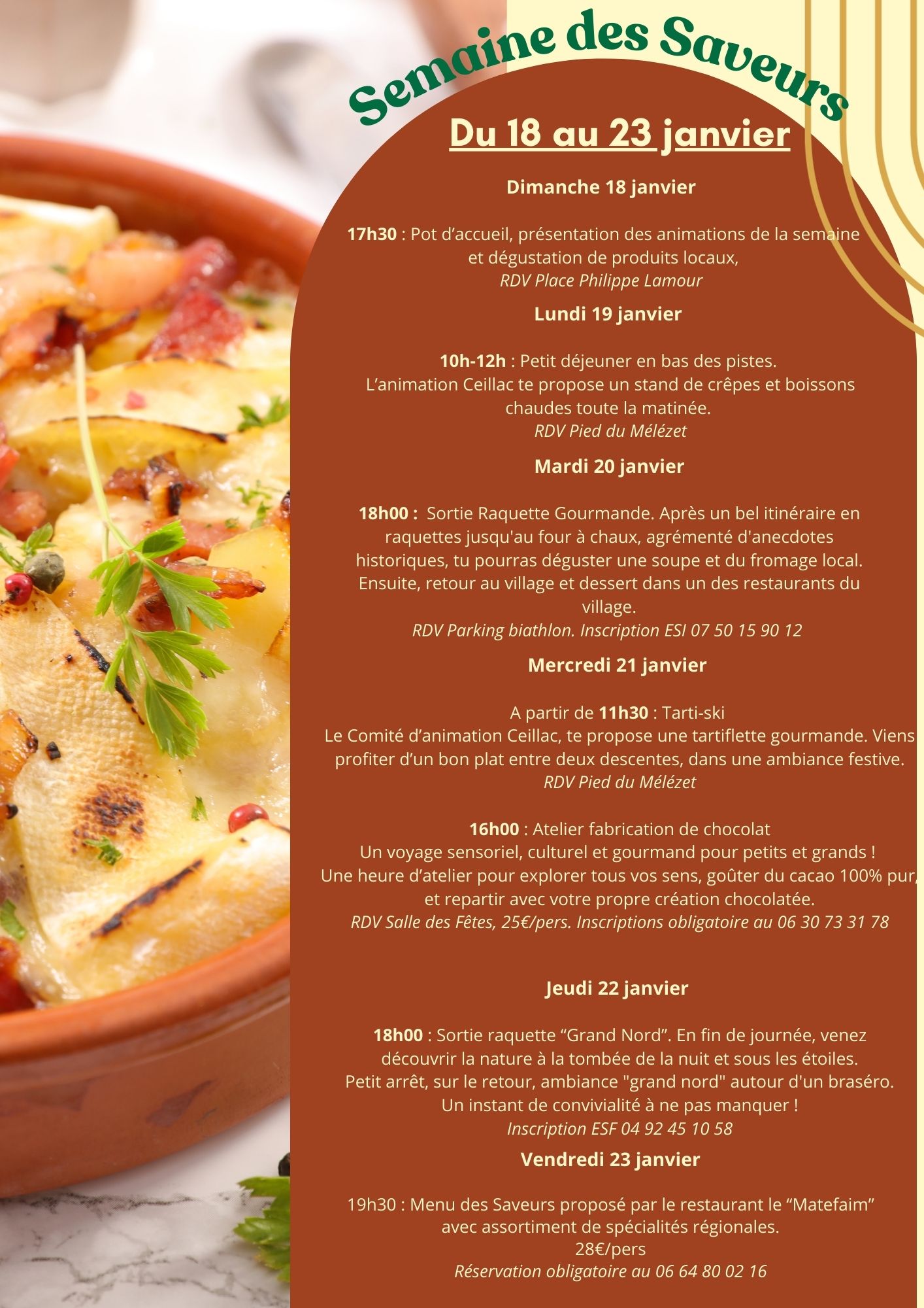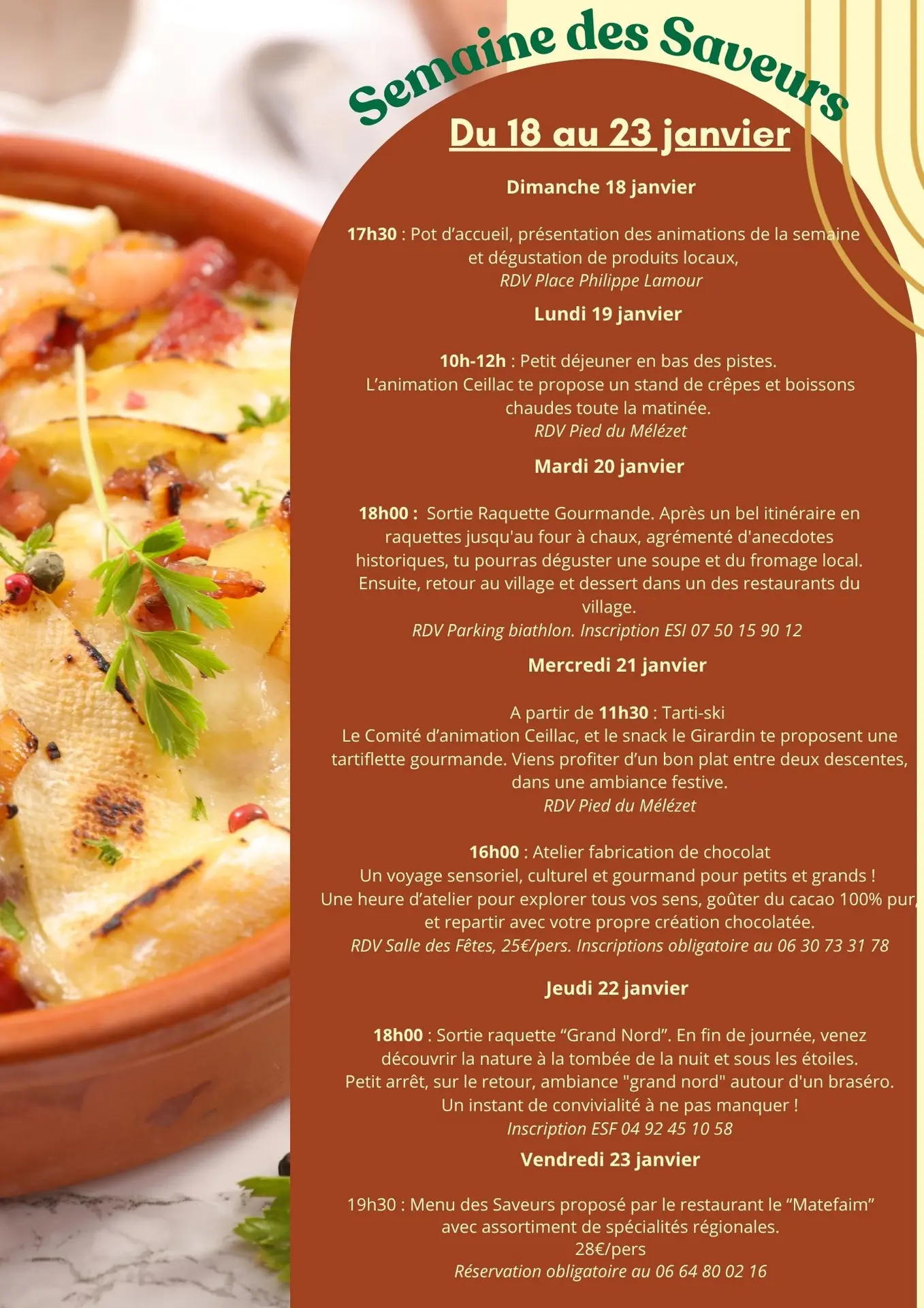 Savoure une parenthèse gourmande au cœur des montagnes ! Entre spécialités locales, douceurs chocolatées et moments partagés, la Semaine des Saveurs réunit petits et grands pour un voyage authentique mêlant plaisir, convivialité et traditions.