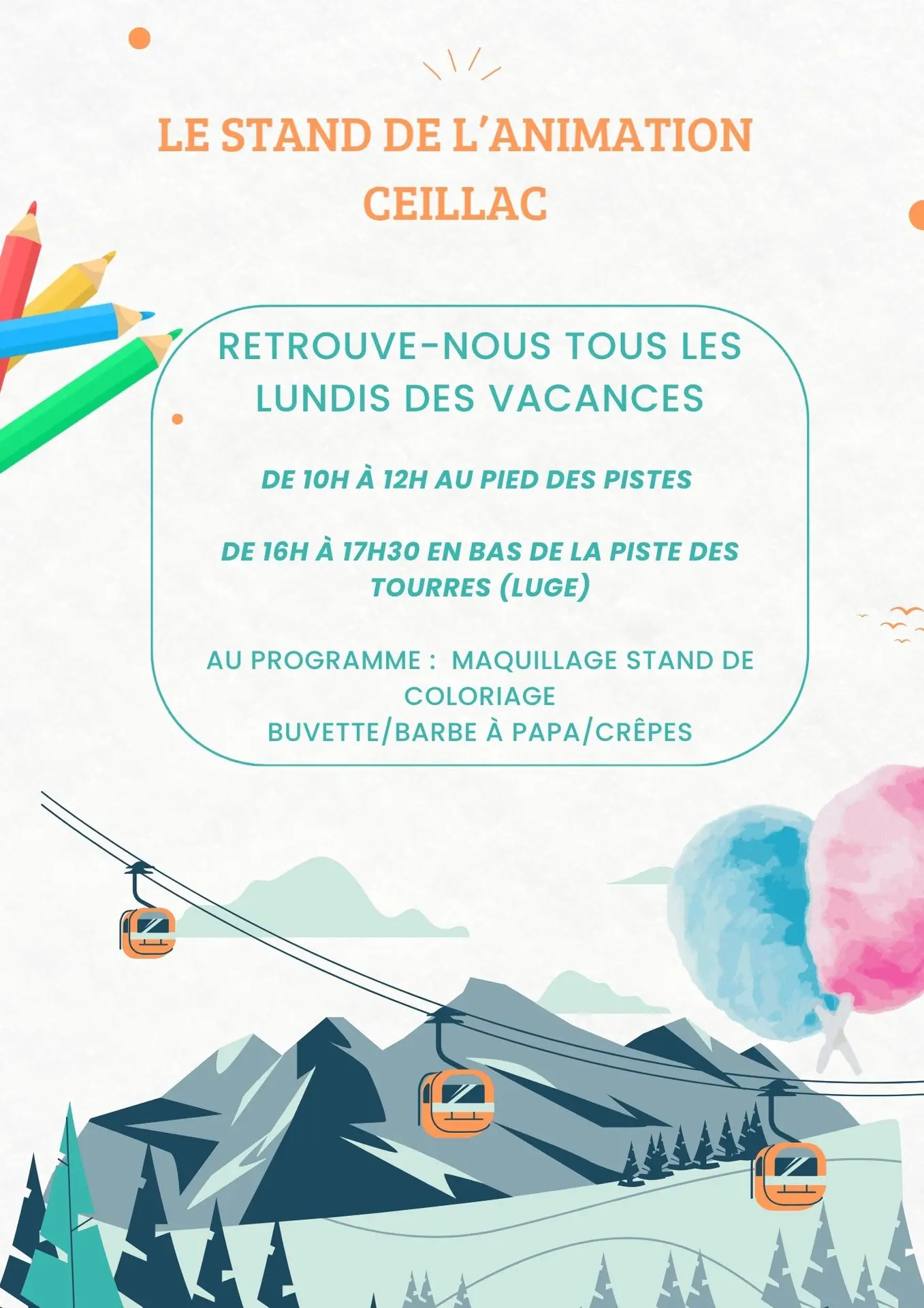 Les lundsi des vacances scolaires, Aude t'accueille de 10h à 12h au pied des pistes de ski alpin et de 16h à 17h30 en bas de la pise de luge des tourres avec maquillage, coloriage, barbe à papa, buvette et crêpes !