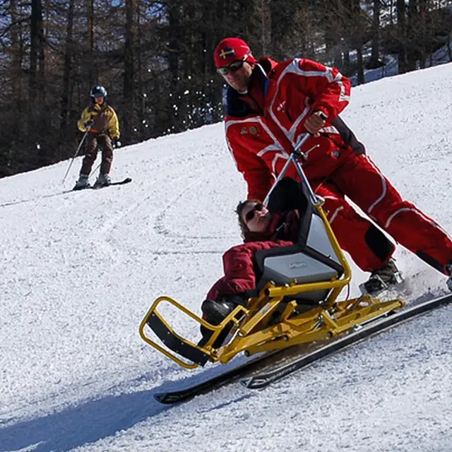 Les pilotes formés à la conduite de fauteuil ski te proposent de te mener faire quelques glissades sur le front de neige d'Aiguilles. Apporte juste ton sourire et ta bonne humeur !