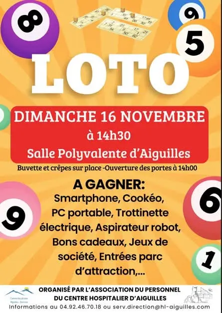 De nombreux lots sont à gagner au profit des résidents de l'hôpital local d'Aiguilles : smartphone, cookéo, PC portable, trottinette électrique, aspirateur robot, bons cadeaux, jeux de société, entrées parc d'attraction et bien d'autres lots encore !!