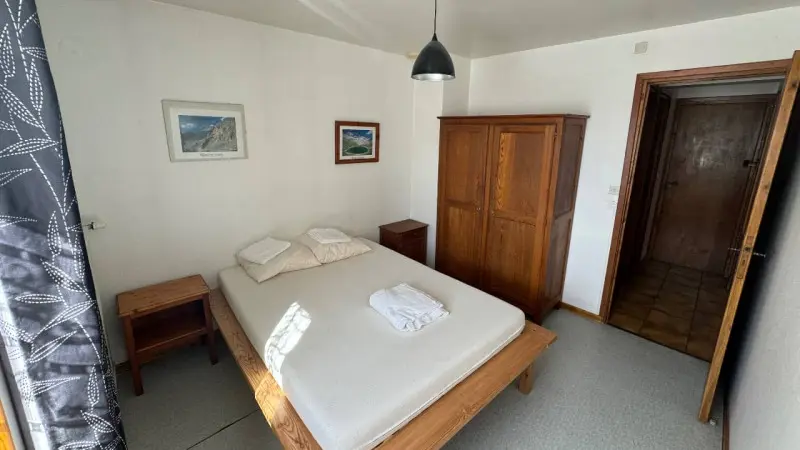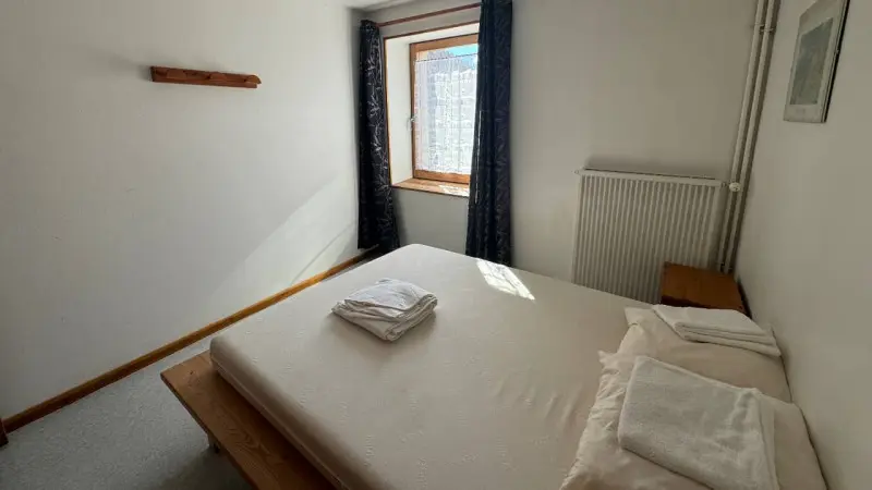 Une chambre avec un lit double et une chambre avec 4 lits simples superposés. Un grand salon séjour cuisine toute équipée.